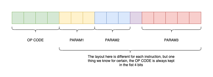 The first 4 bits always represent the OpCode (Operation Code). The remaining 12 bits encode 1, 2, or 3 parameters, depending on the specific instruction.