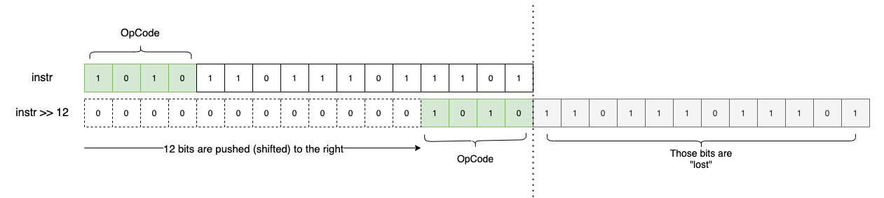 Once we identify the OpCode, we know exactly how to “decode” or extract the remaining parameters from the uint16_t. To extract the OpCode, we use a utility macro that employs a simple bitwise shift: