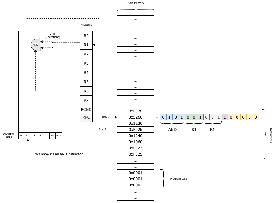R0is a general-purpose register. It is also used for reading and writing data to and fromstdinandstdout.R1throughR7are additional general-purpose registers.RPC(Program Counter) is the register that holds the memory address of the next instruction to be executed.RCND(Condition Flag) is the conditional register. It stores status flags that provide information about the result of the most recent operation performed by the ALU (Arithmetic Logic Unit).