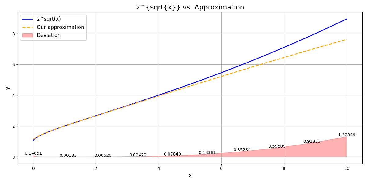Computing $3^{\sqrt{3}}$ with our function yields: $6.58$ instead of $6.70$. Not terrible.