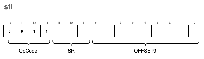 sti | 0xB | 0b1011 | sti | Store indirect |
