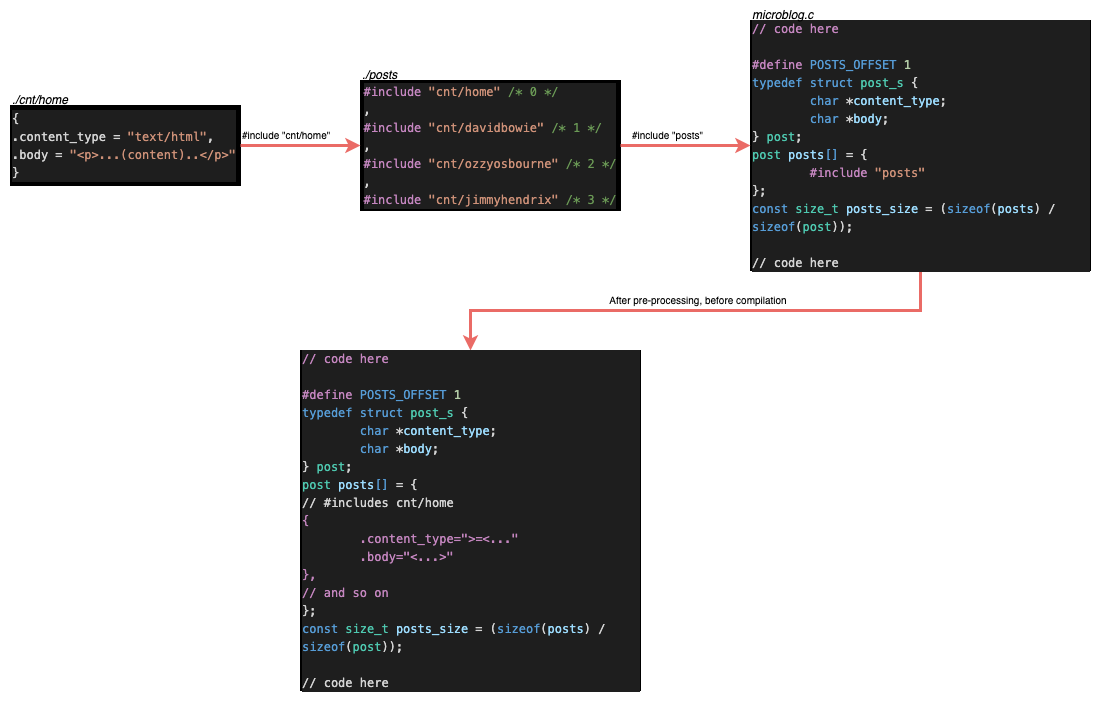 Our main strategy is to keep all the blog posts inside a global array of post posts[], which is completely known at compile-time: