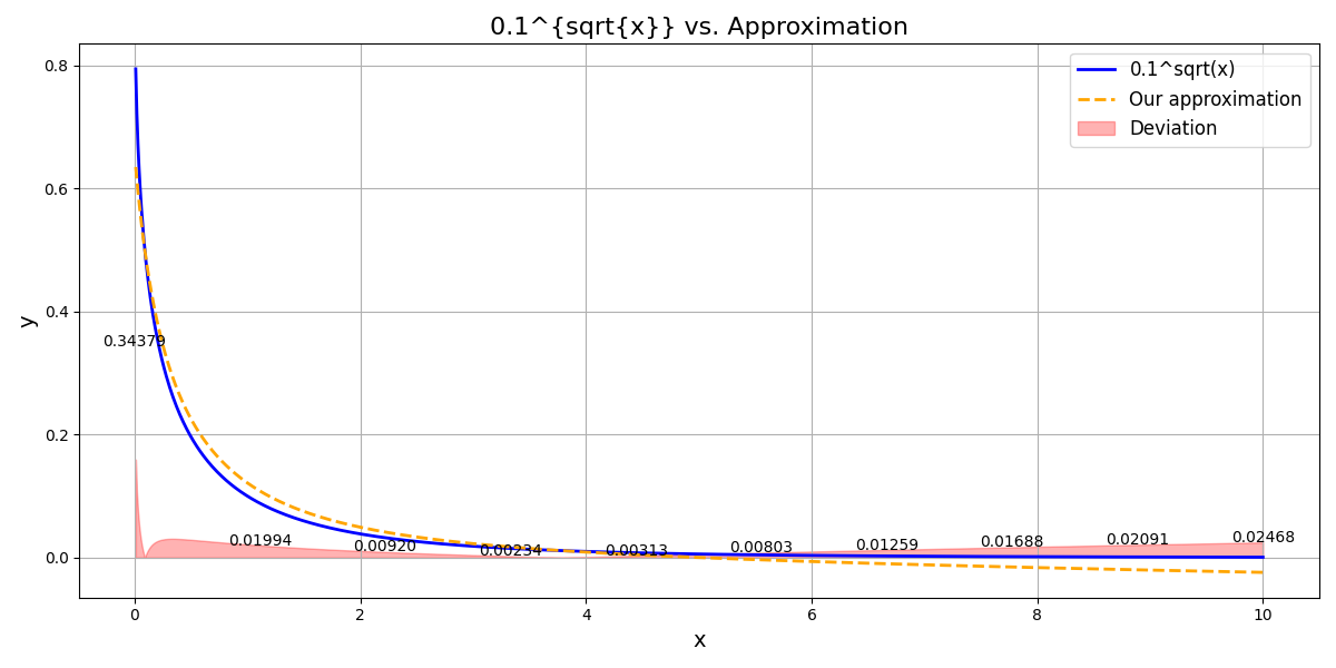 The deviation for $0.1^{\sqrt{x}}$, $2^{\sqrt{x}}$ and $3^{\sqrt{x}}$