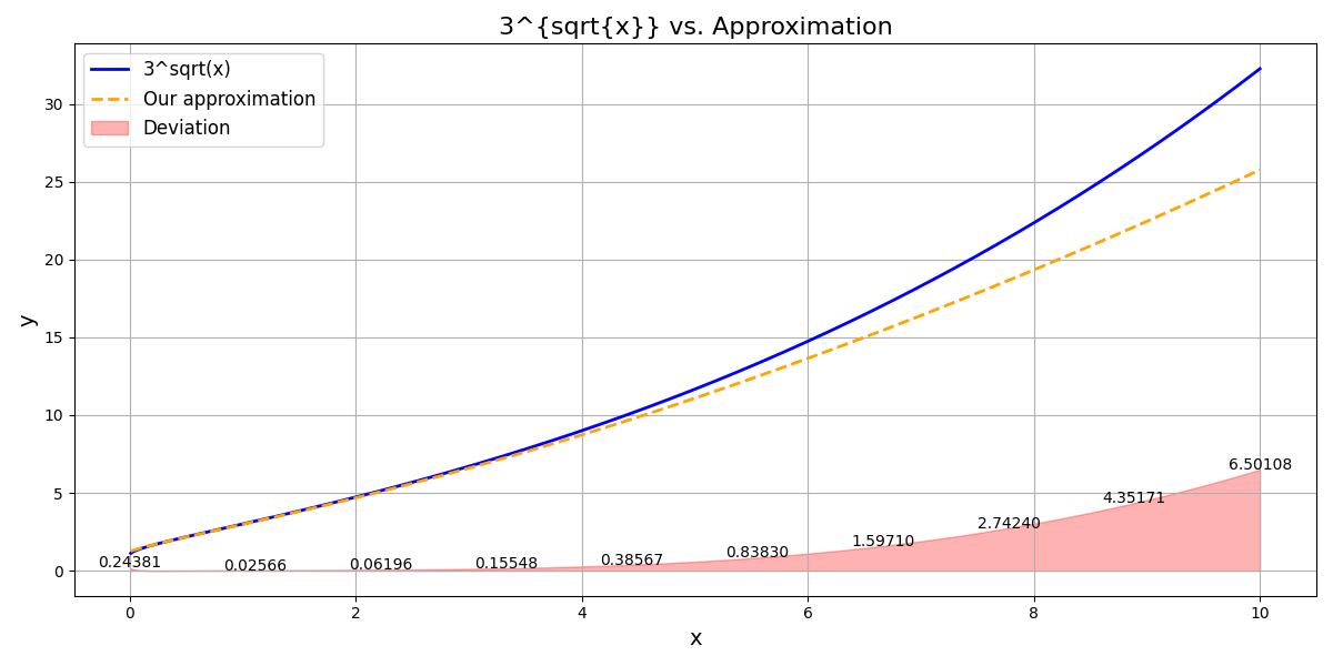 Computing $3^{\sqrt{3}}$ with our function yields: $6.58$ instead of $6.70$. Not terrible.