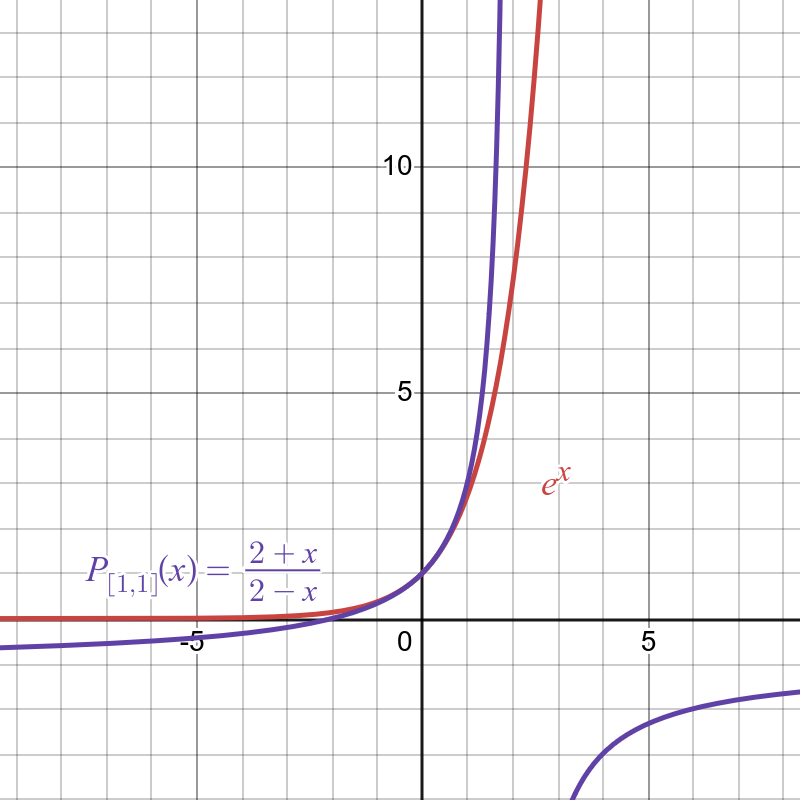 Needless to say, I was curious how well those approximations actually work, so I’ve computed the Padé aproximation of order [1/1], $P_{[1/1]}(x)$ for $e^x$. (For in depth tutorial follow the Professor’s Penn tutorial, linked above).