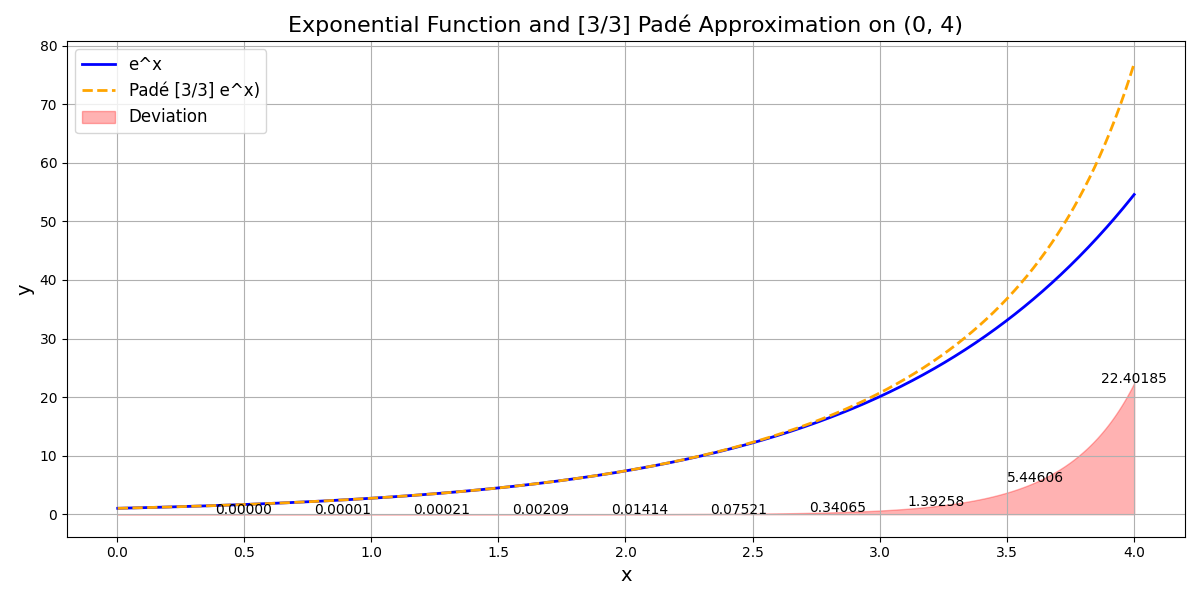 - To compute $e^x$ for $x \in (0,4)$, we use: $\frac{-120-60x-12x^{2}-x^{3}}{-120+60x-12x^{2}+x^{3}}$.