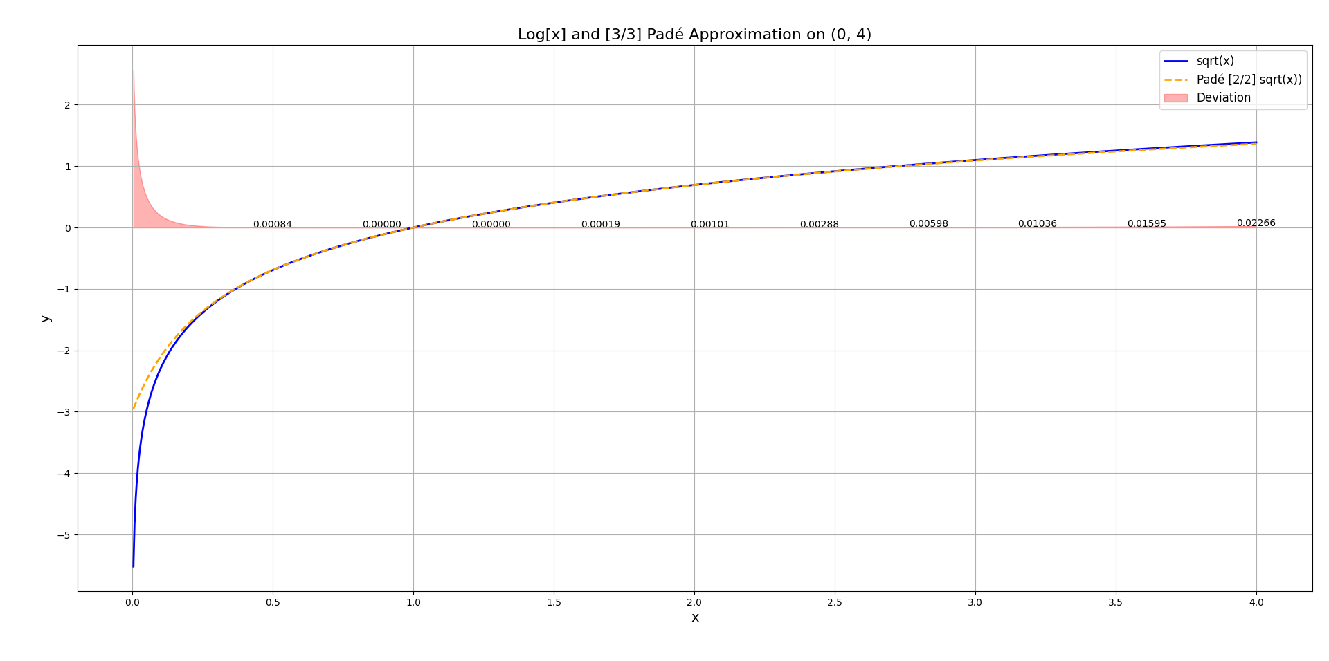And it’s get better, for the $\ln x$ function the equivalent [2/2] Padé approximation is: $\frac{3(x-1)(x+1)}{x^{2}+4x+1}$. Notice how the approximation is bad if $x < 0.5$. For this we should find a better function.