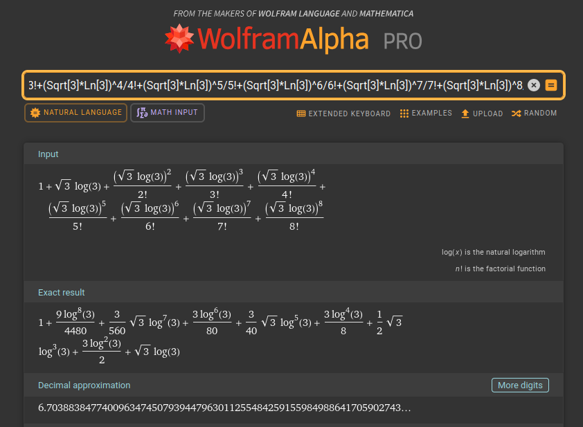 1+Sqrt[3]*Ln[3]+(Sqrt[3]*Ln[3])^2/2!+(Sqrt[3]*Ln[3])^3/3!+(Sqrt[3]*Ln[3])^4/4!+(Sqrt[3]*Ln[3])^5/5!+(Sqrt[3]*Ln[3])^6/6!+(Sqrt[3]*Ln[3])^7/7!+(Sqrt[3]*Ln[3])^8/8!